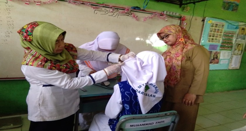 Martapura. Senin, 22 Oktober 2018. MTsN 6 Banjar lakukan kerjasama dengan puskesmas Martapura Tanjung Rema dalam kegiatan penjaringan kesehatan bagi seluruh siswa kelas VII. Kegiatan seperti ini sudah berlangsung rutin dari tahun ke tahun dilaksanakan. Adapun siswa kelas VII yang dilakukan penjaringan kesehatan oleh pihak puskesmas berjumlah 160 anak. Kegiatan penjaringan kesehatan ini meliputi kesehatan mulut, gigi, telinga, pengukuran tinggi, dan berat badan, serta pemberian obat bagi siswa yang terindikasi kurang darah ( anemia ).